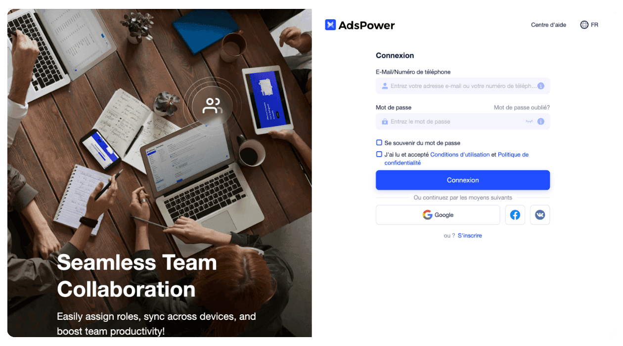 1. Lancez AdsPower sur votre ordinateur. 2. Entrez les identifiants fournis par notre équipe (Utilisateur & Mot de passe). 3. Cliquez sur « Log in » pour accéder à votre tableau de bord.